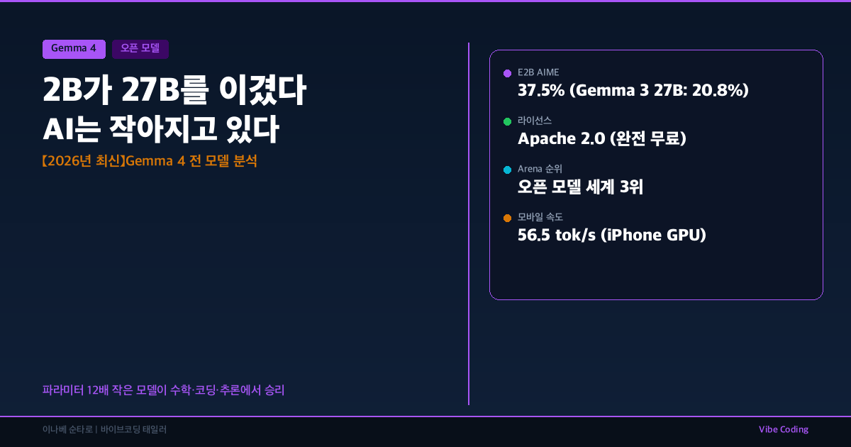 4월 2일에 나온 Google Gemma 4. 가장 작은 모델(2.3B)이 전 세대 가장 큰 모델(27B)을 수학이랑 코딩에서 이겼다. 12배 작은 모델이 더 똑똑하다. 대체 무슨 일이 벌어지고 있는 건지 정리해봤다.